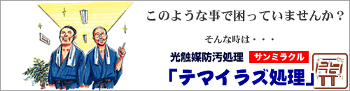 触媒とは、それ自身が変化せず他の物質の化学反応を速める、または遅らせる物質です。光触媒とは、光のエネルギーにより触媒の働きをする物質のことをいいます。この光触媒の性質を利用し、細菌やウイルスなどの有機物を分解するというすぐれた機能を持たせたものが光触媒テマイラズで、消臭・殺菌・防汚・防カビ(これらの原因物資のほとんどが有機物です)のために開発された画期的な透明コーティング剤です。